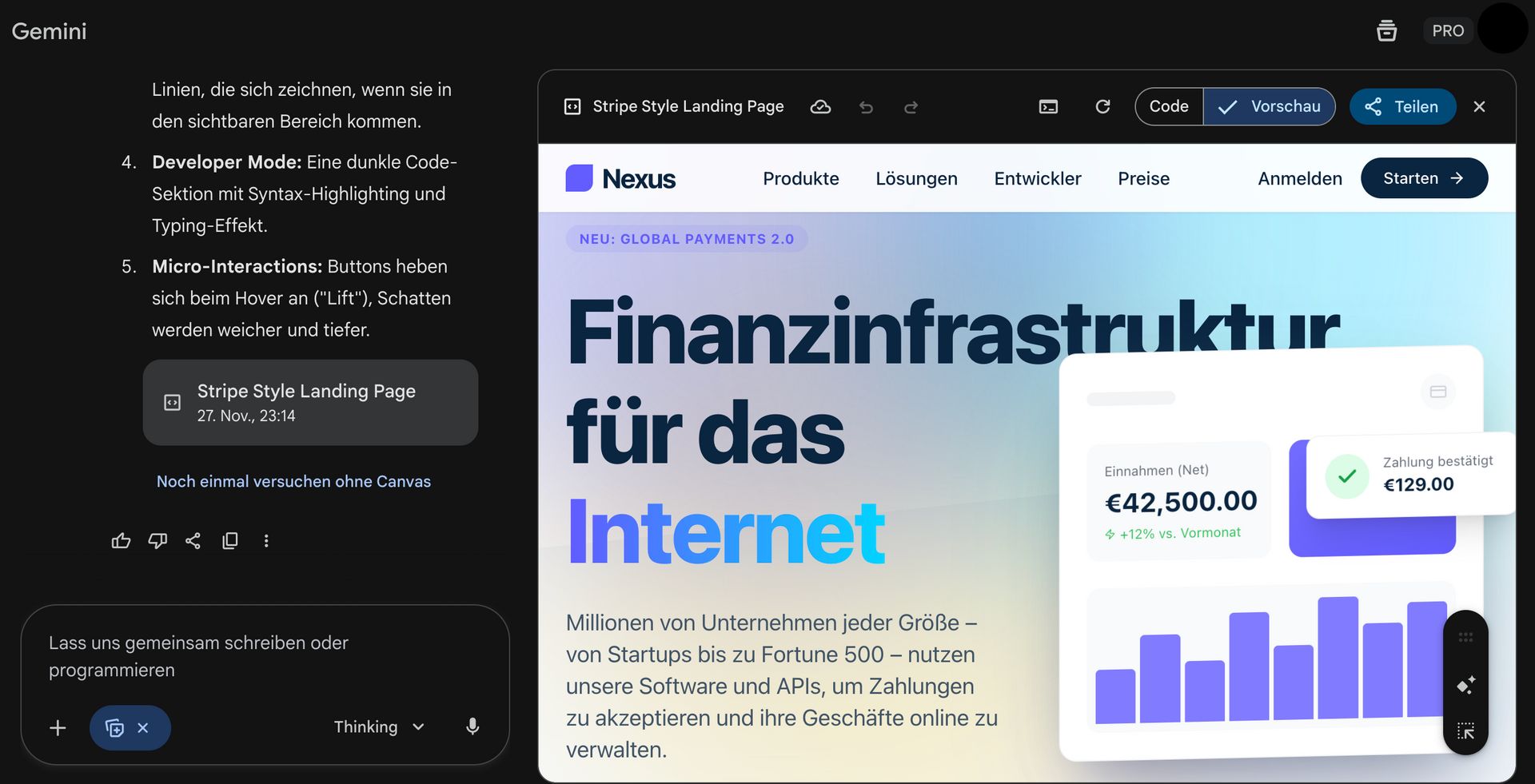 🚀 Profi-Tipp: Gemini 3 Pro ist besonders stark darin, Videos auf Animationen und UI-Spezifikationen zu analysieren und diese in funktionsfähige Landingpages und Websites umzuwandeln.