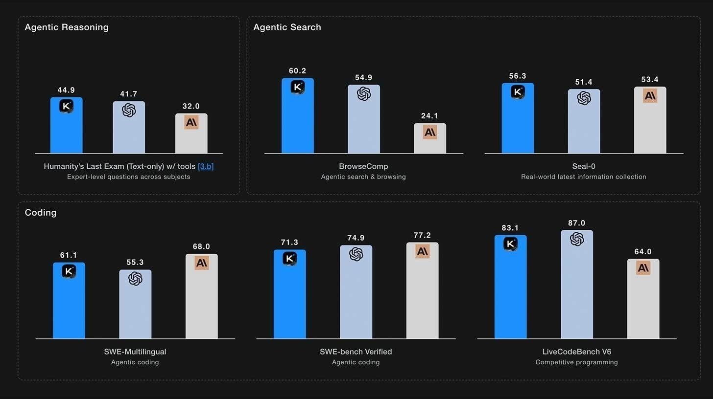 Kimi übertraf GPT-5 und Sonnet 4.5 in mehreren agentenbasierten Tests und erzielte mit 44,9 Prozent einen neuen Spitzenwert im Benchmark Humanity’s Last Exam.