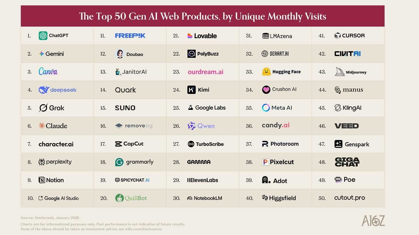 📊 a16z veröffentlicht neuen Consumer AI Top 100 Report