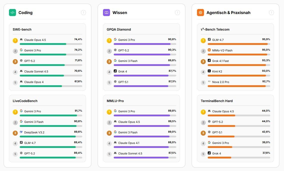 🚀 Profi-Tipp: Der Gesamtscore zeigt das beste Allround-Modell. Aber wenn ihr primär Code schreiben wollt, sortiert nach dem Coding-Score. Für Recherche ist der Wissens-Score relevanter. Das beste Modell ist immer das, das zu eurem konkreten Anwendungsfall passt.